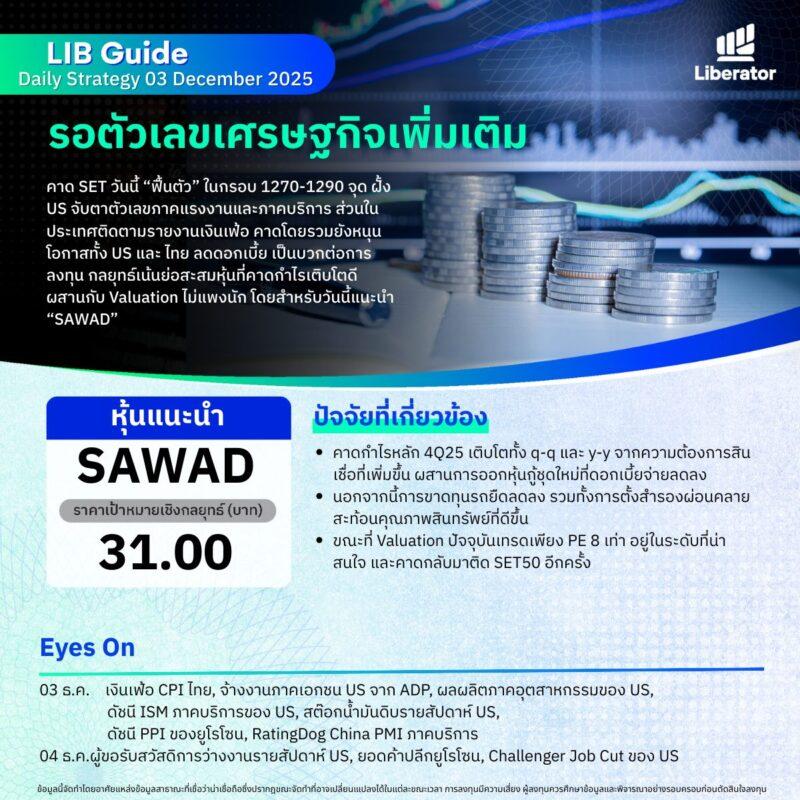 บทวิเคราะห์ “LIB Guide Daily Strategy” ประจำวันพุธที่ 3 ธันวาคม 2568 หัวข้อ “รอตัวเลขเศรษฐกิจเพิ่มเติม”