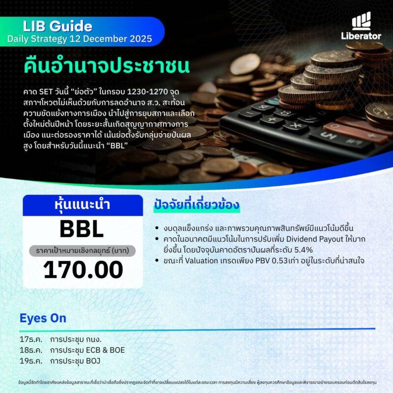 วันที่ 12 ธันวาคม 2568 บริษัทหลักทรัพย์ ลิเบอเรเตอร์ จำกัด หรือ “Liberator” (บล.ลิเบอเรเตอร์) ออกบทวิ