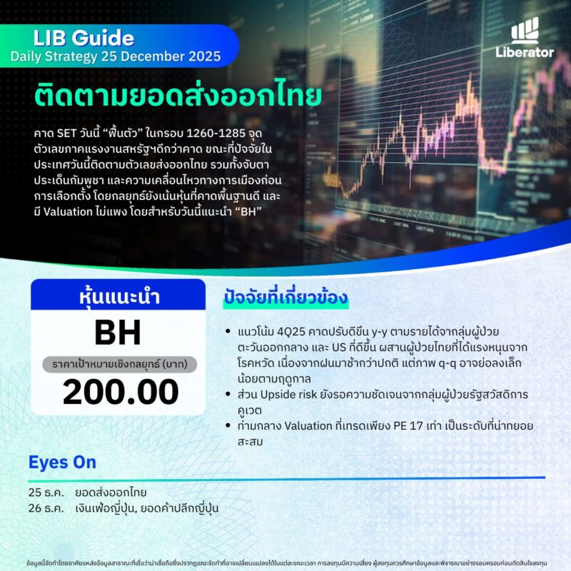 วันที่ 25 ธันวาคม 2568 บริษัทหลักทรัพย์ ลิเบอเรเตอร์ จำกัด หรือ “Liberator” (บล.ลิเบอเรเตอร์) ออกบทวิ